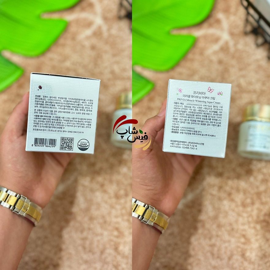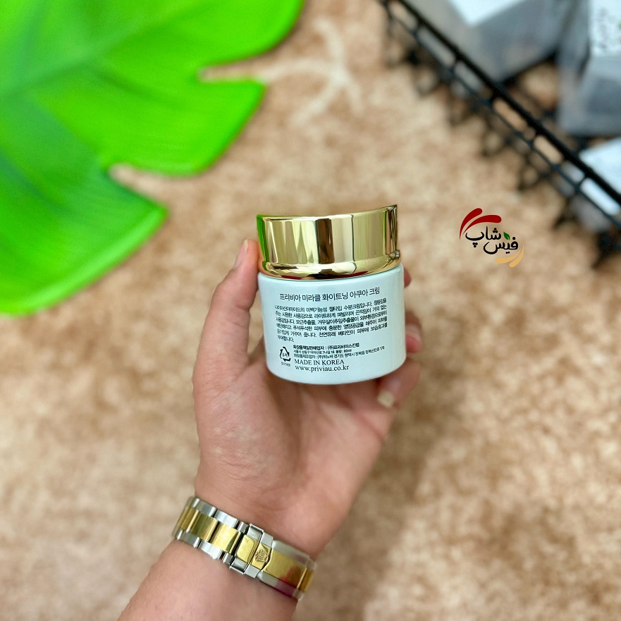 کرم سفید کننده و ضدلک آکوا میراکل پریویا برای انواع پوست ها عالی است. این کرم دارای فواید مواد مغذی برای کمک به مرطوب کردن پوست است. این کرم ژل مانند با ترکیبات مرطوب کننده در فرمول خود می تواند خاصیت ارتجاعی را به پوست بازگرداند. برخی از ترکیبات عبارتند از عصاره ریشه Imperata Cylindrica، عصاره دارواش کره ای و آدنوزین. عصاره ریشه Imperata Cylindrica دارای مزایای افزایش هیدراتاسیون و همچنین تقویت کلاژن و افزایش متابولیسم سلولی است. از سوی دیگر، آدنوزین از مخمری به دست می آید که برای تسکین، انرژی بخشیدن به پوست و کاهش چین و چروک عمل می کند. این کرم همچنین به عنوان یک ماسک خواب برای روشن کردن پوست شما برای صبح روز بعد عمل می کند.